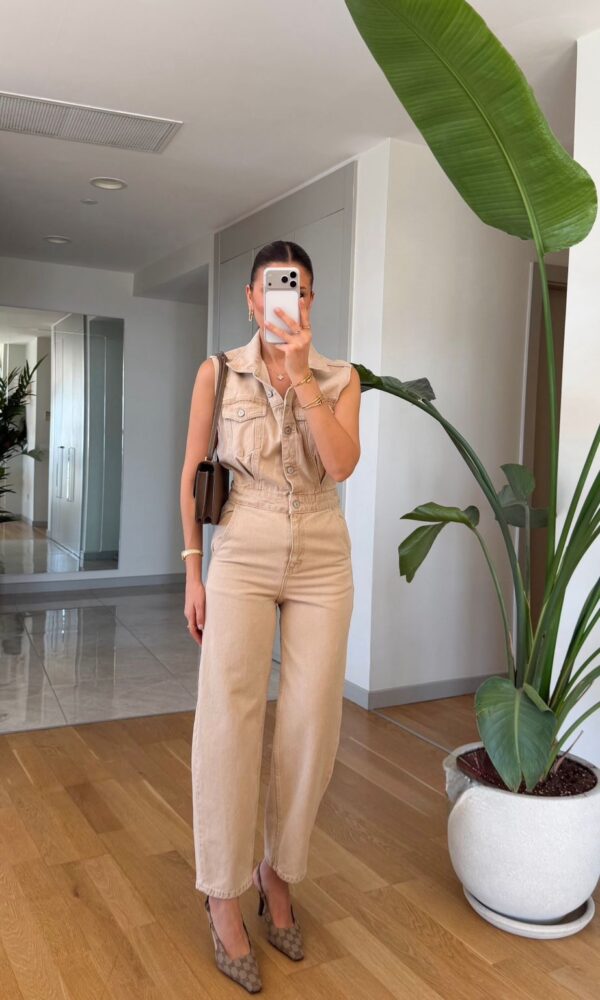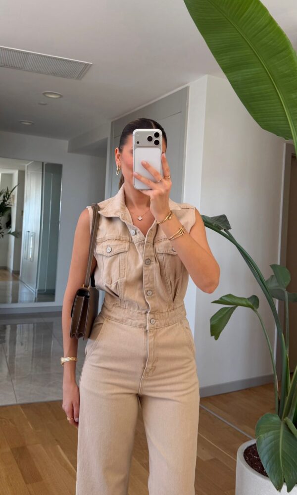 Sleeveless Beige Denim Jumpsuit