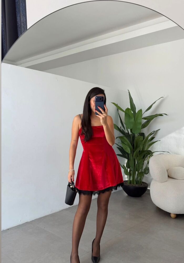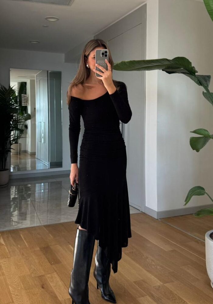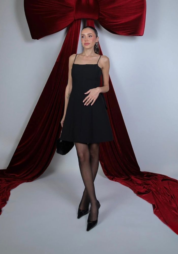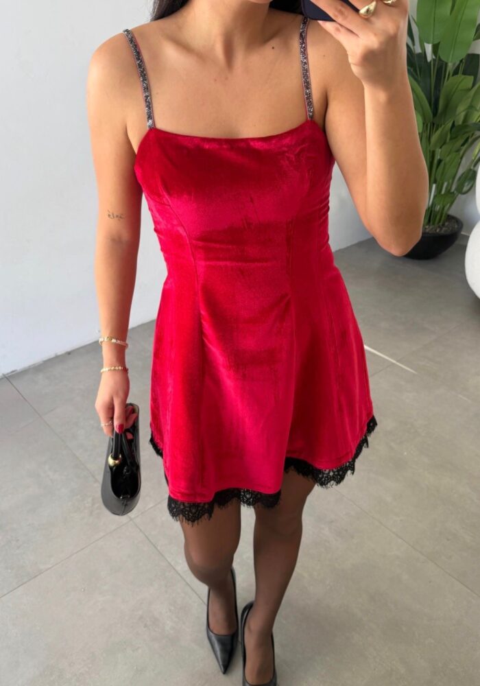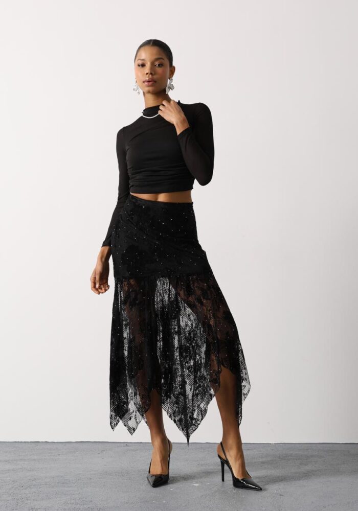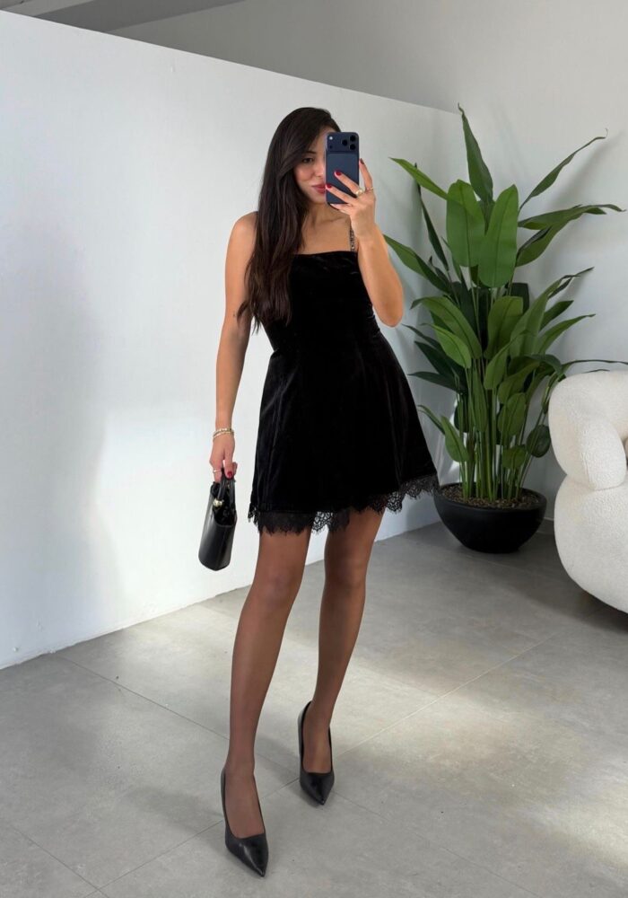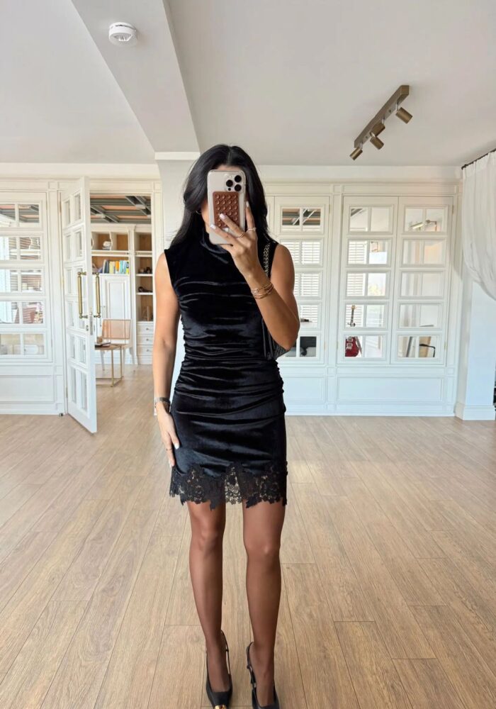 Astral Black Draped Zero Sleeve Skirt Lace Velvet Dress