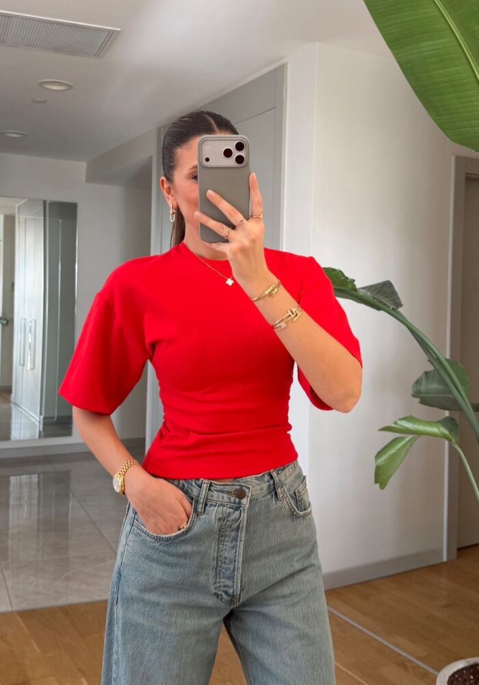 Red Asymmetric Button Detail Blouse