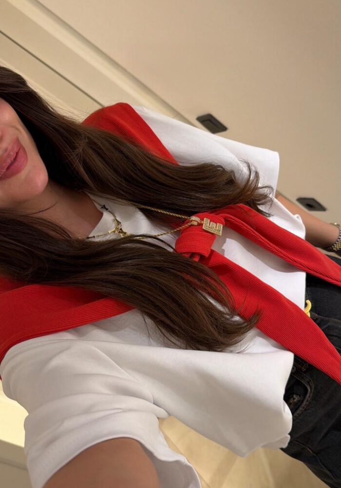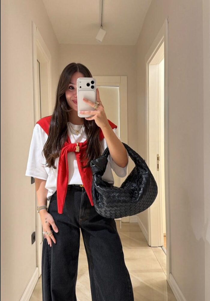 White Woven Top With Red Scarf