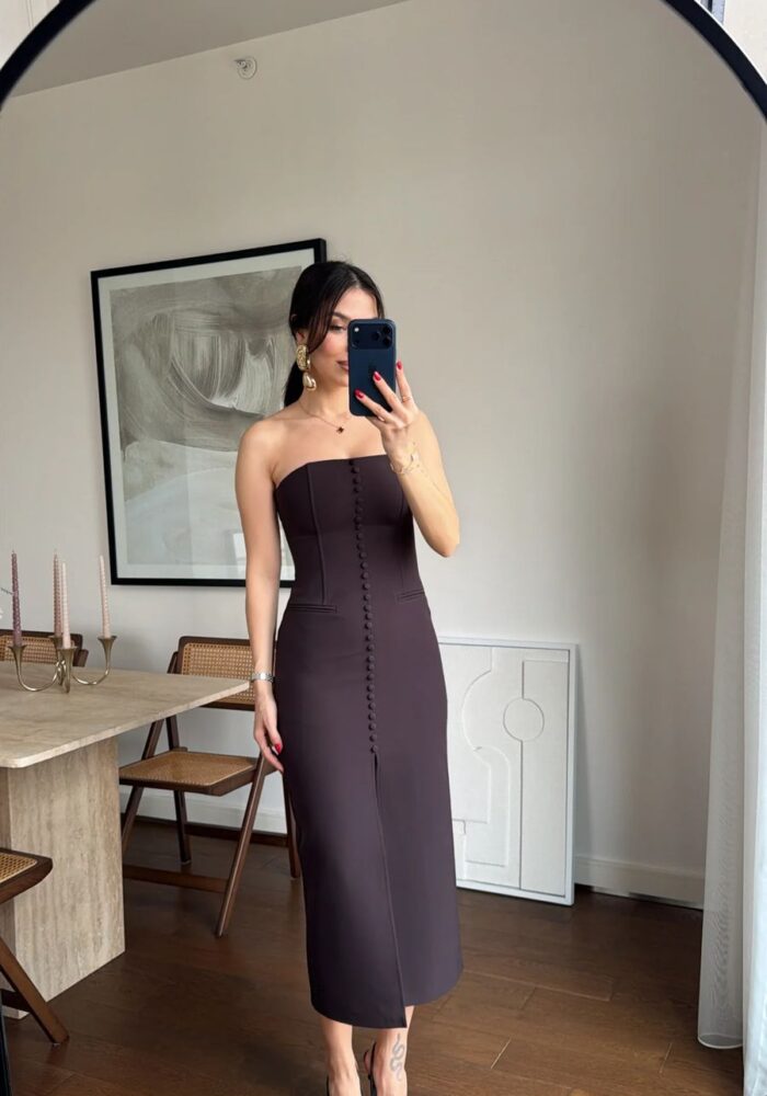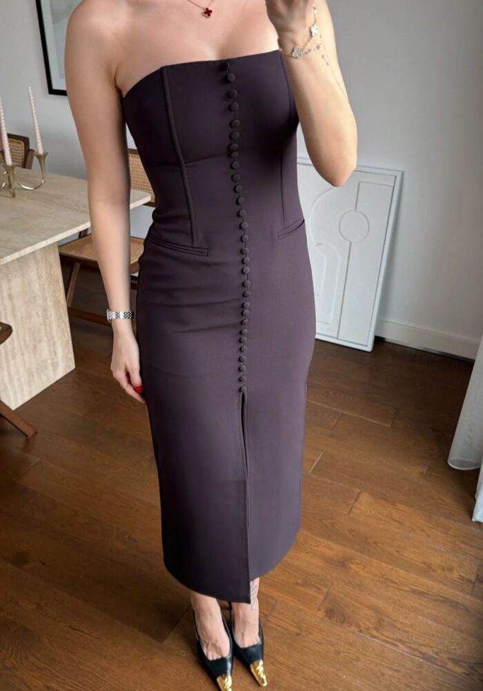 Strapless Button Front Black Midi Dress