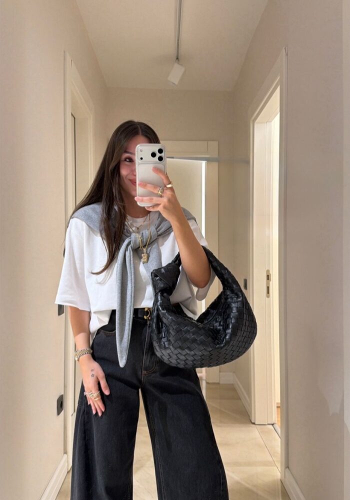 White Woven Top With Grey Scarf