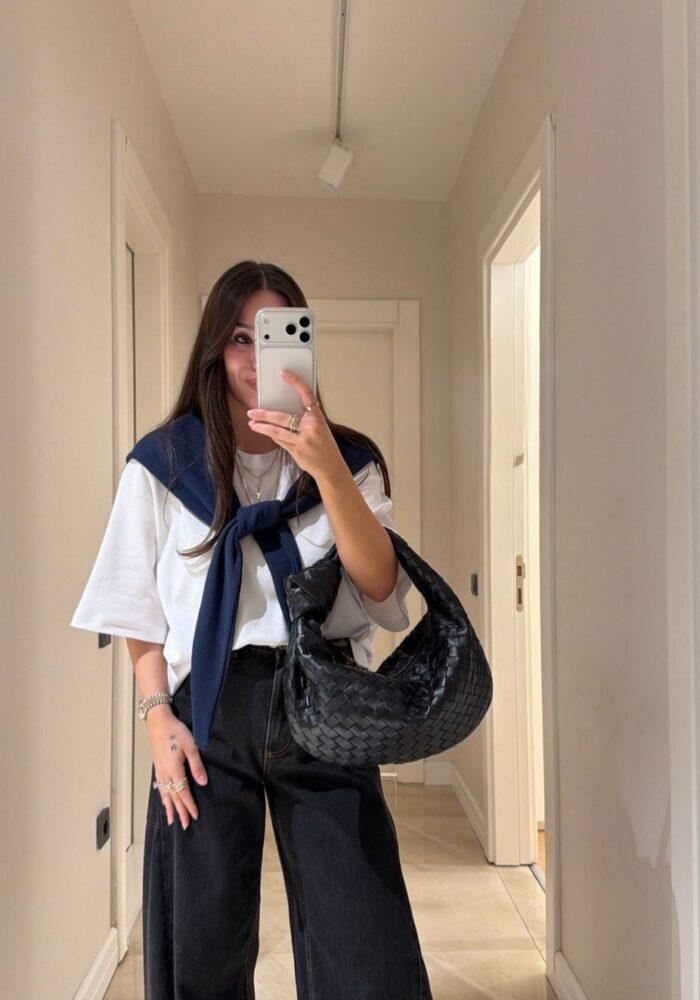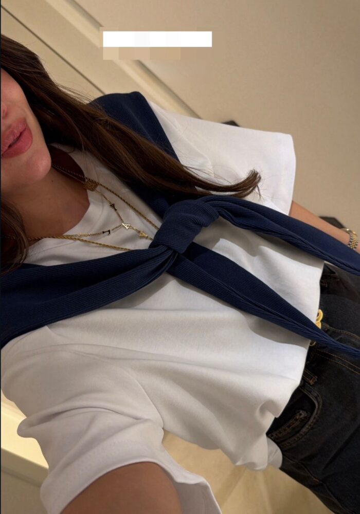 White Woven Top With Navy Scarf