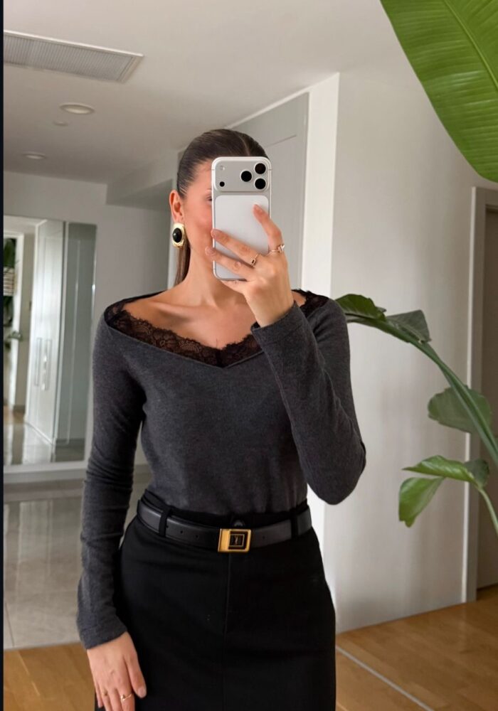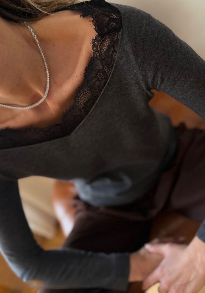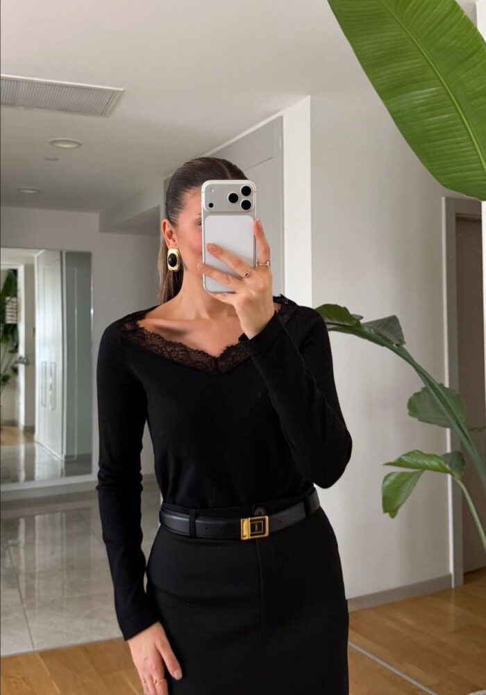 Black Lace Trim V-neck Long Sleeve Top