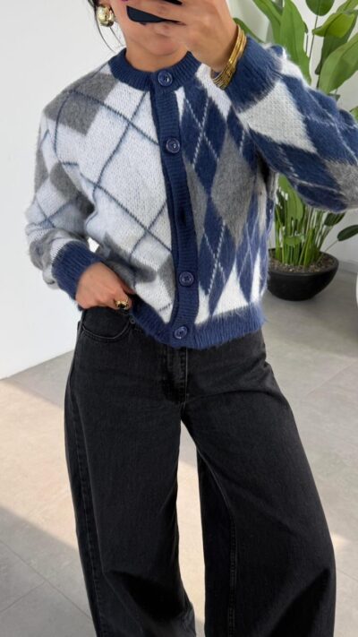 Navy Blue Polo Collar Buttoned Brand Model Buklet Cardigan