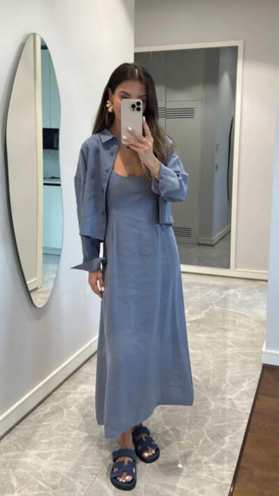 Blue Long Sleeve Maxi Dress And Shirt