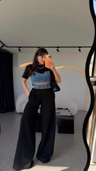 Denim Crop Top With Wide Leg Pants Set