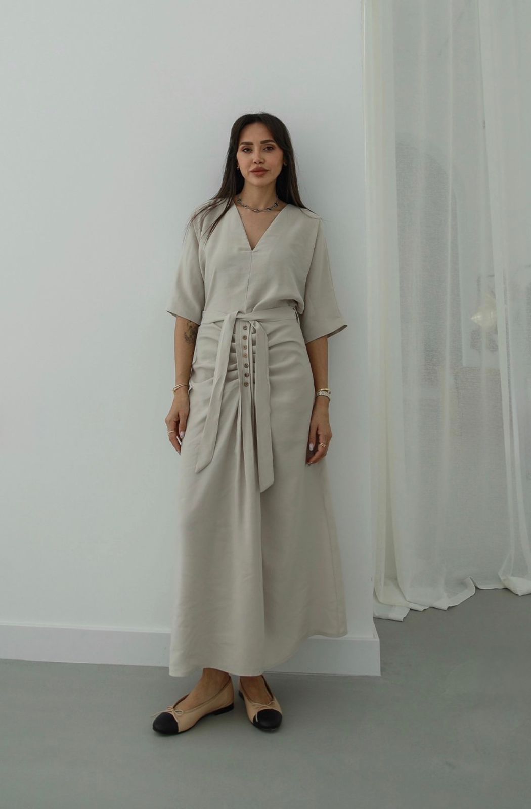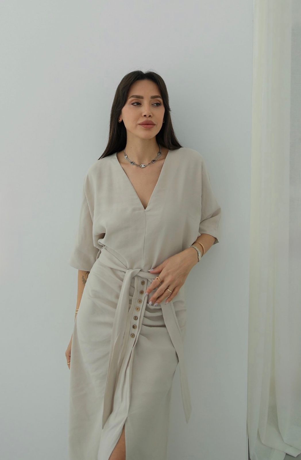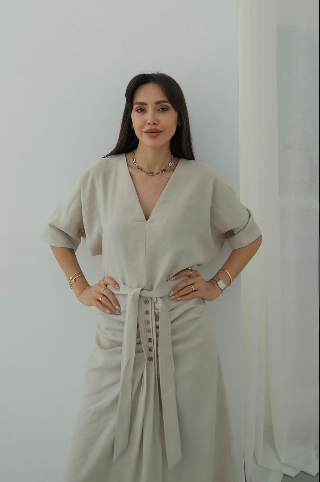 Beige Button Front Belted Midi Dress