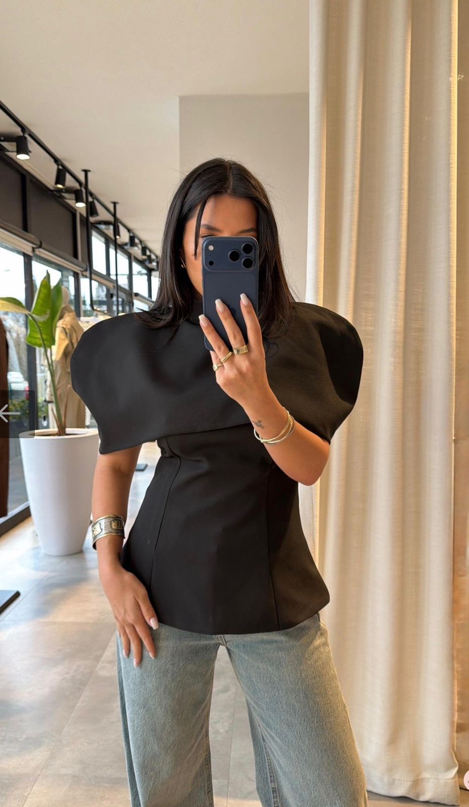 Drape Detail Low Shoulder Textured Navy Blue Blouse