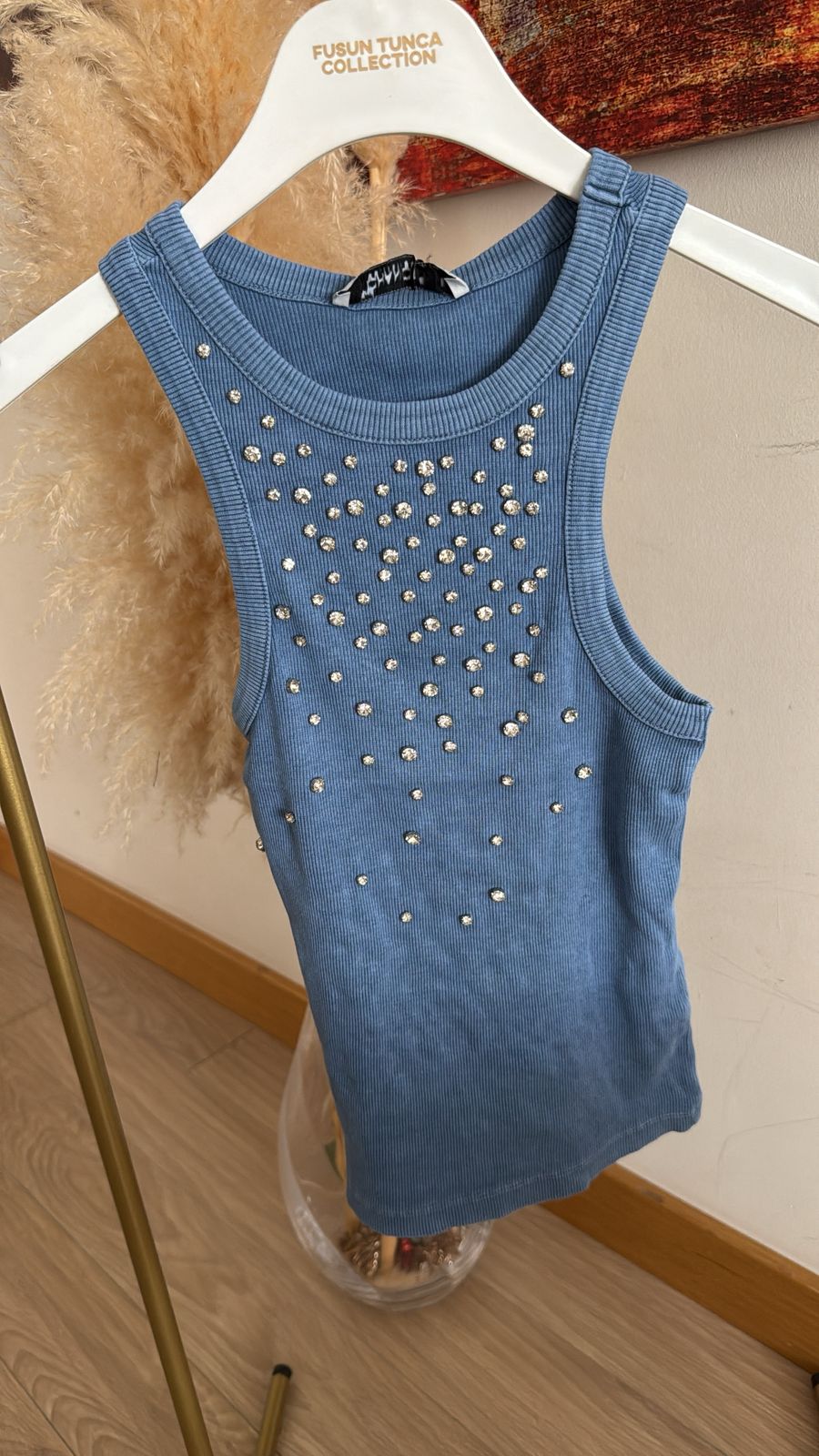 Blue Ribbed Tank Top With Rhinestones
