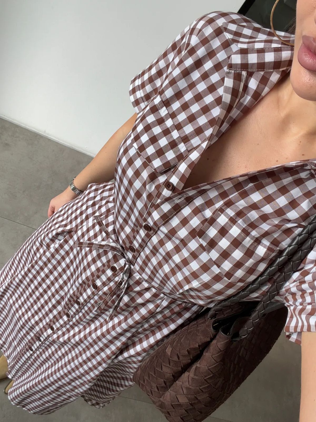 Brown Gingham Button-up Midi Dress