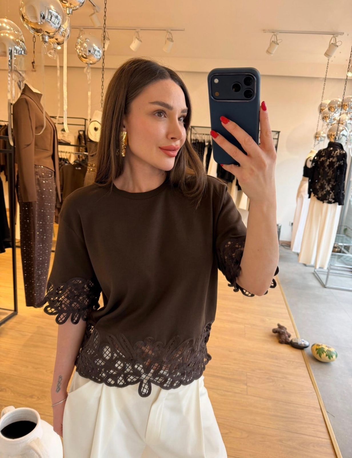 Brown Lace Trim Short Sleeve Blouse