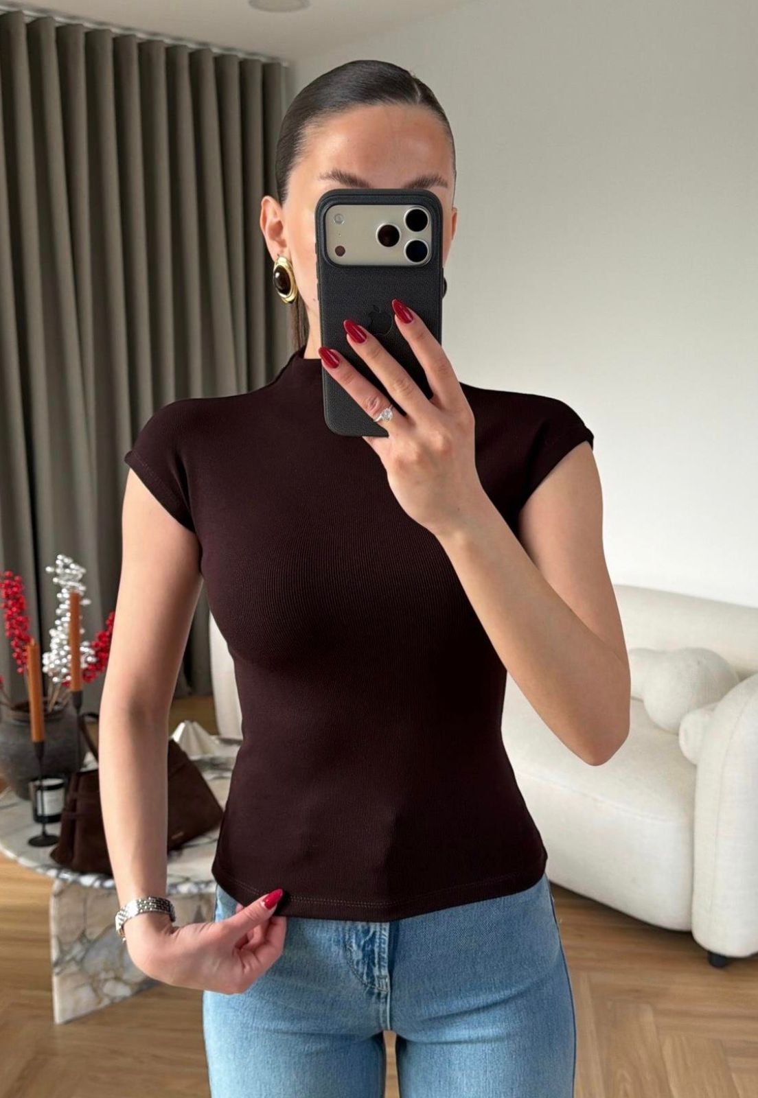 Brown Ribbed Cap Sleeve Mock Neck Top