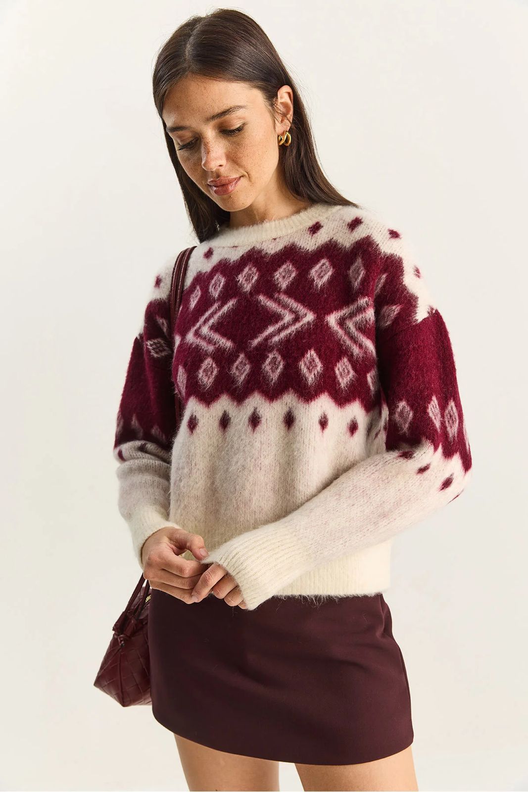 Burgundy And White Knit Pattern Sweater