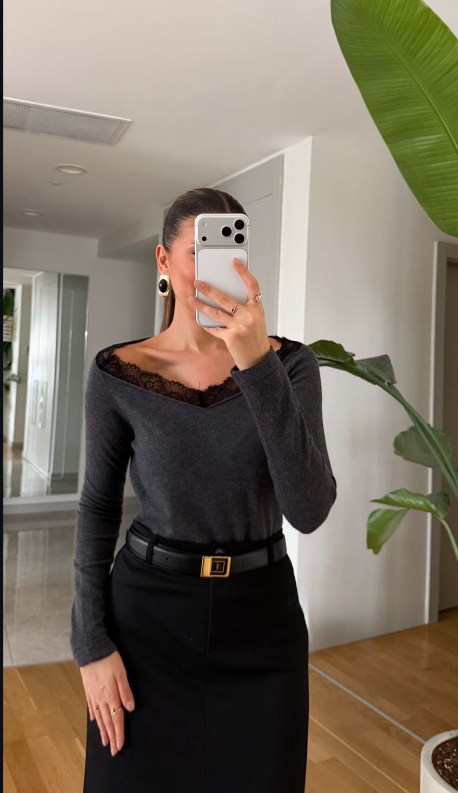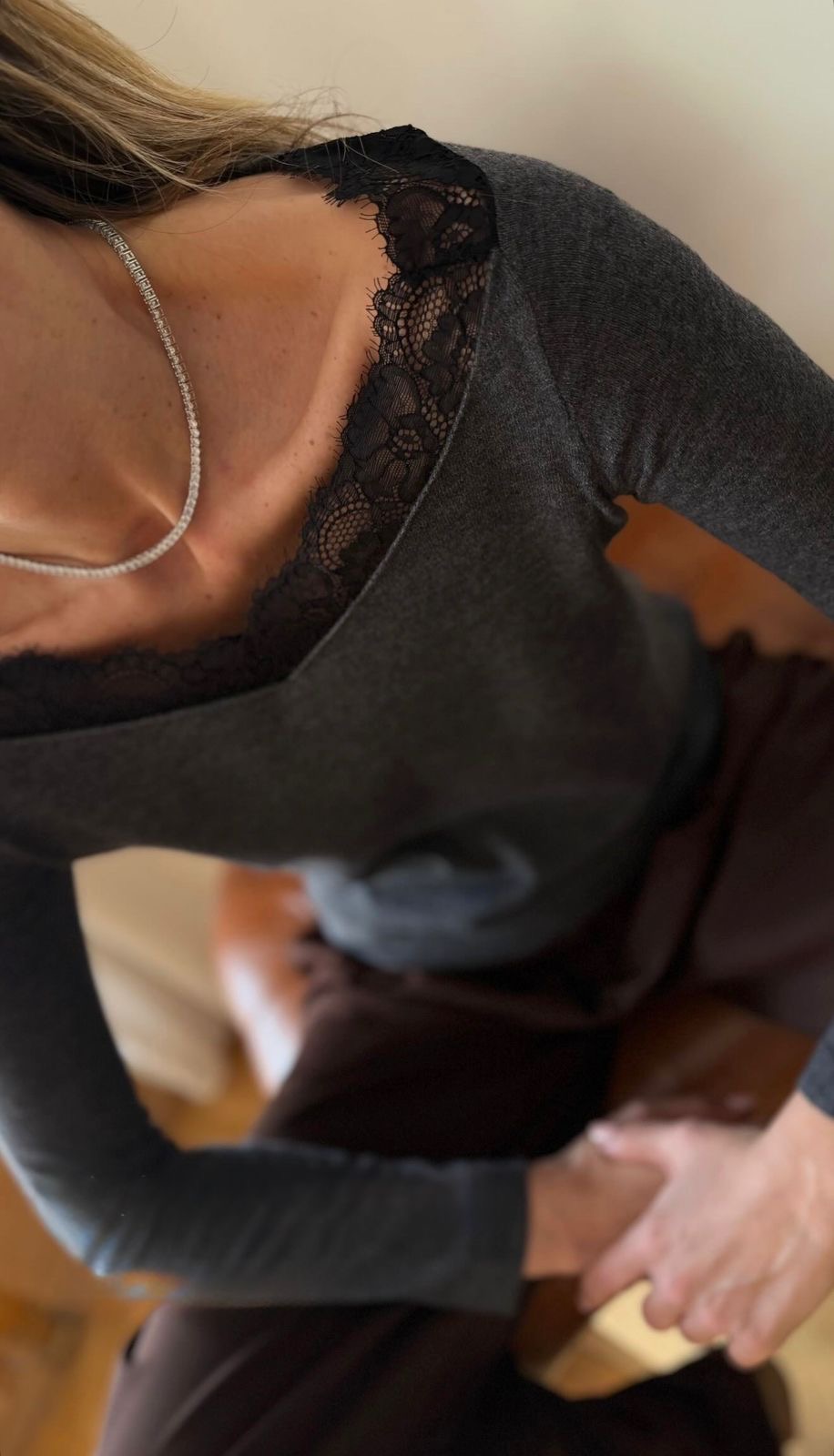 Dark Grey Lace Trim Long Sleeve Top