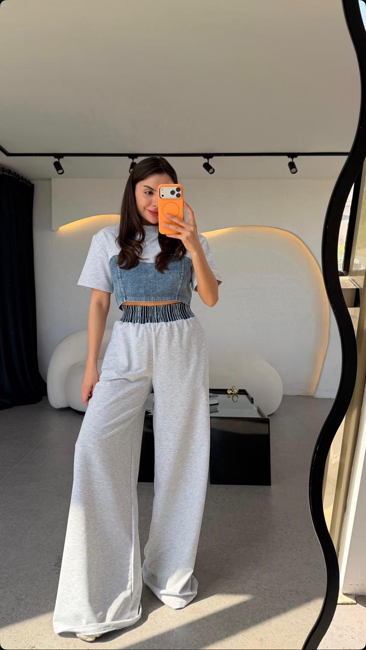 Denim Crop Top With Wide Leg Pants Set
