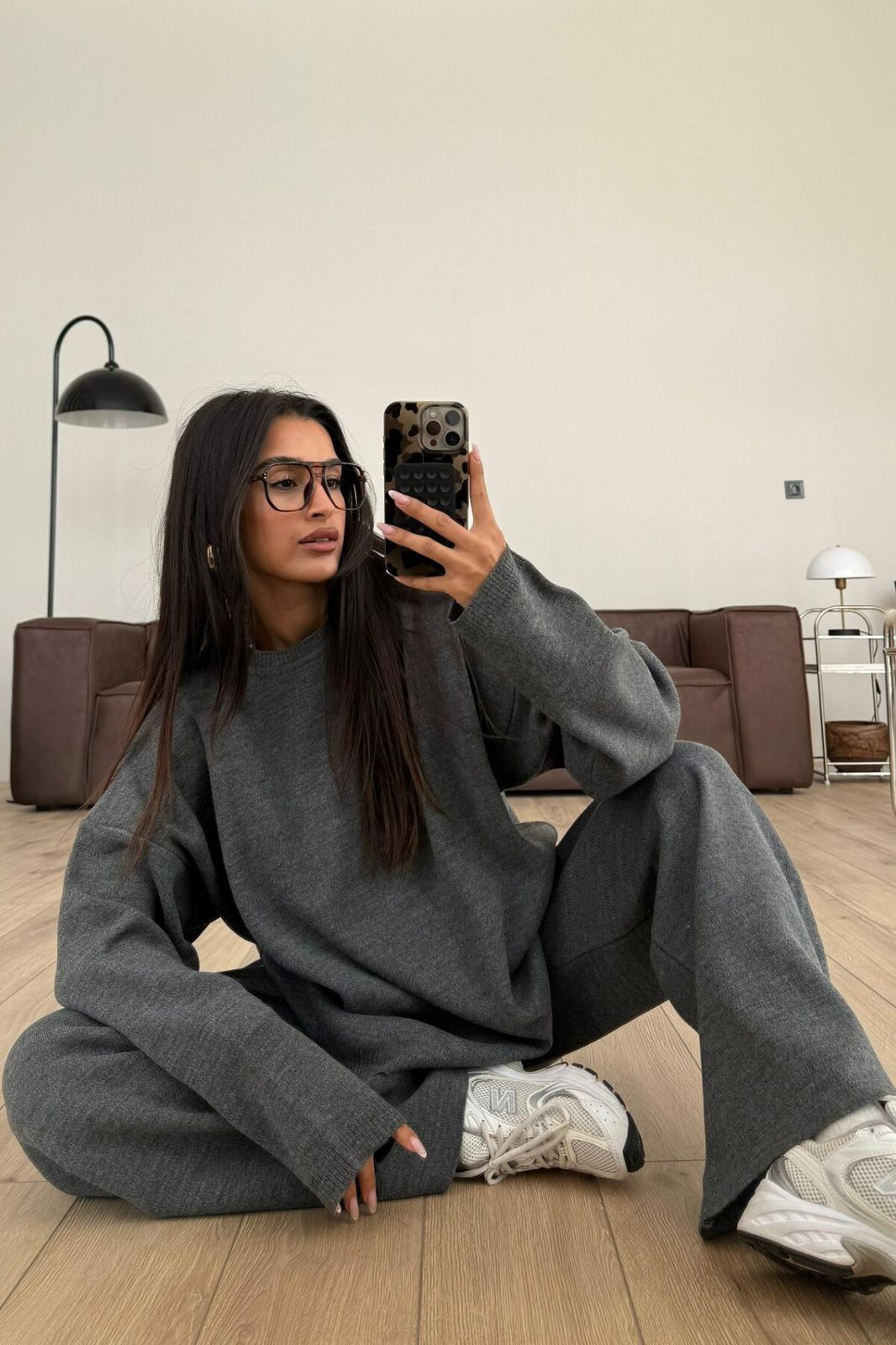 Black-white Checkered Stripe Detailed Trousers Blouse Knitwear Set