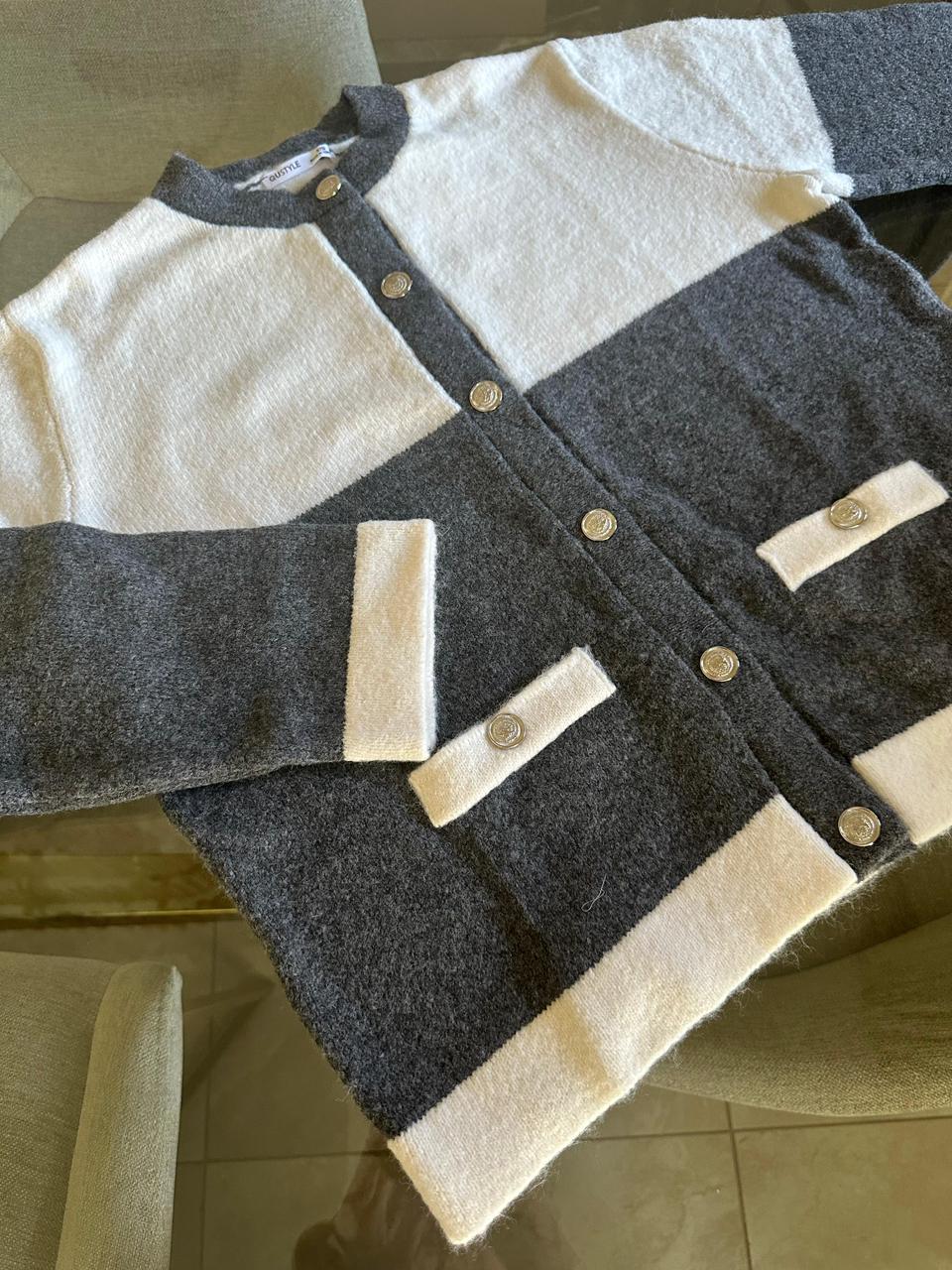 Gray And White Colorblock Knit Cardigan