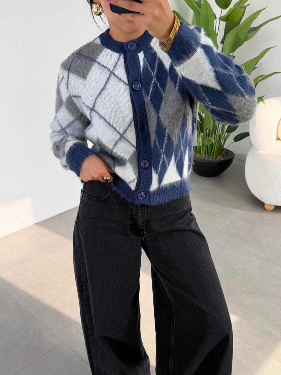 Indigo-bone Baklava Pattern Cardigan