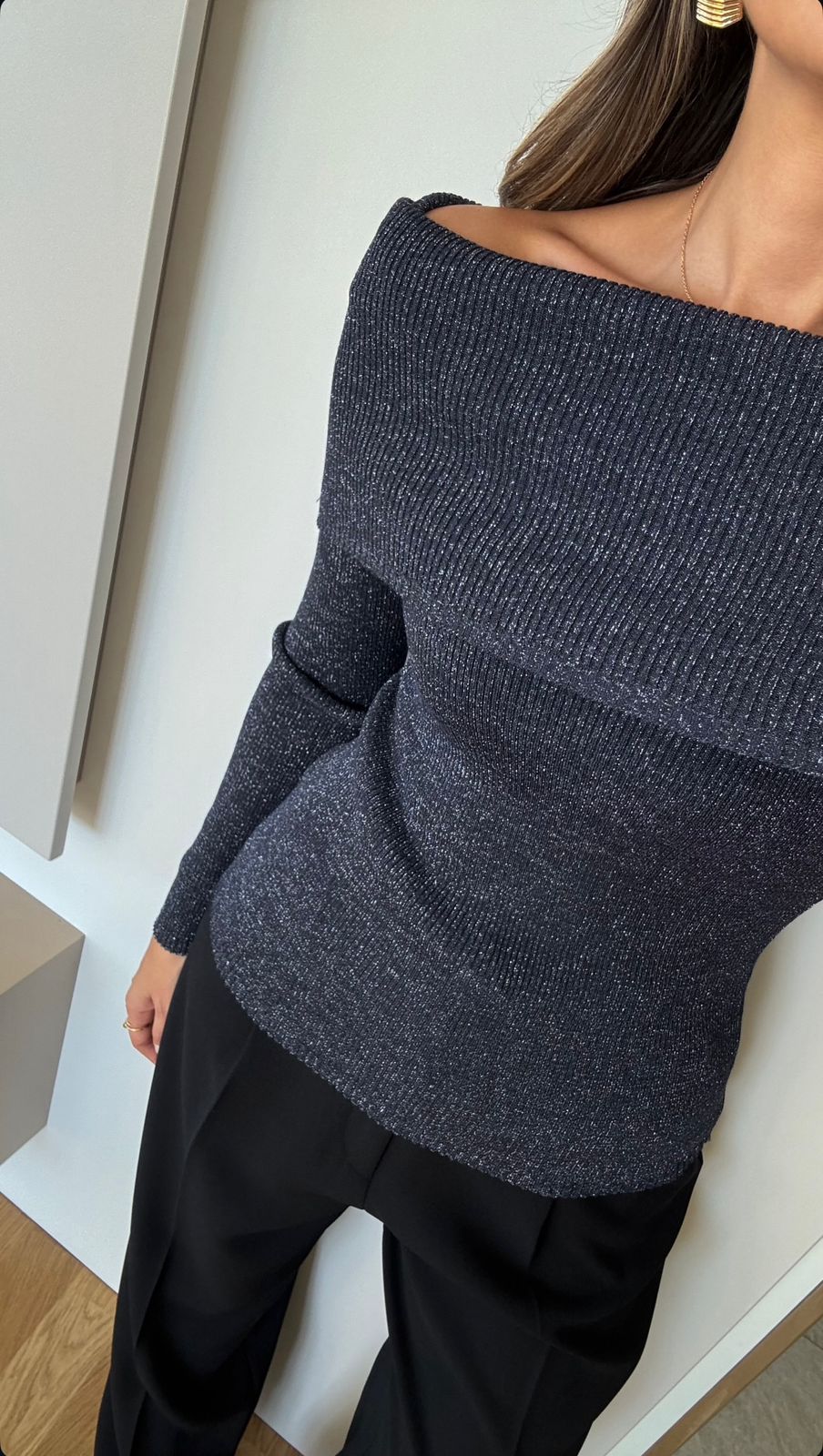 Home Tops Madonna Collar Silvery Knitwear – Navy Blue
