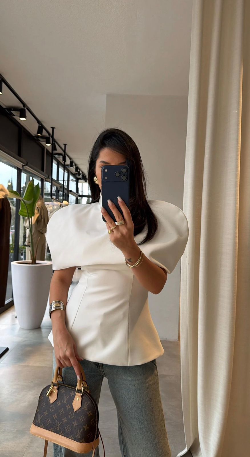 Drape Detail Low Shoulder Textured Navy Blue Blouse
