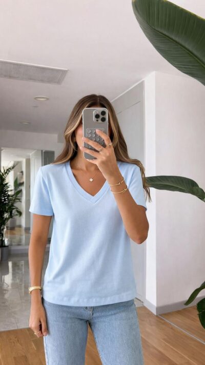 Light Blue V-neck Short Sleeve T-shirt