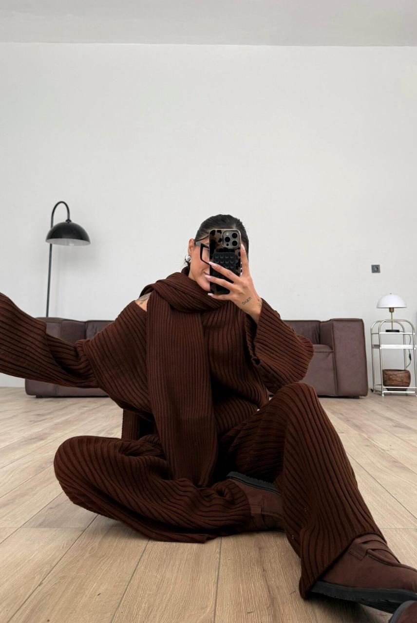 Home Sets Scarfed V Neck Knitwear Set Brown