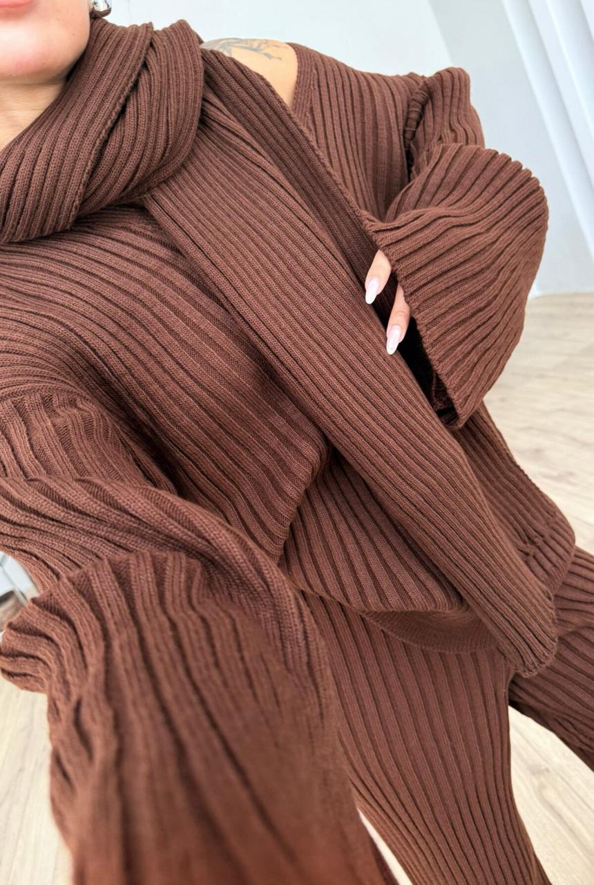 Scarfed V Neck Knitwear Set Brown