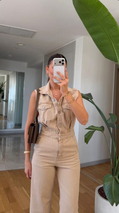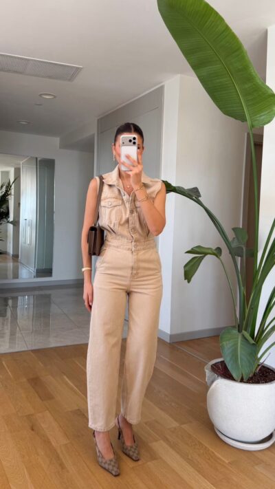 Sleeveless Beige Denim Jumpsuit