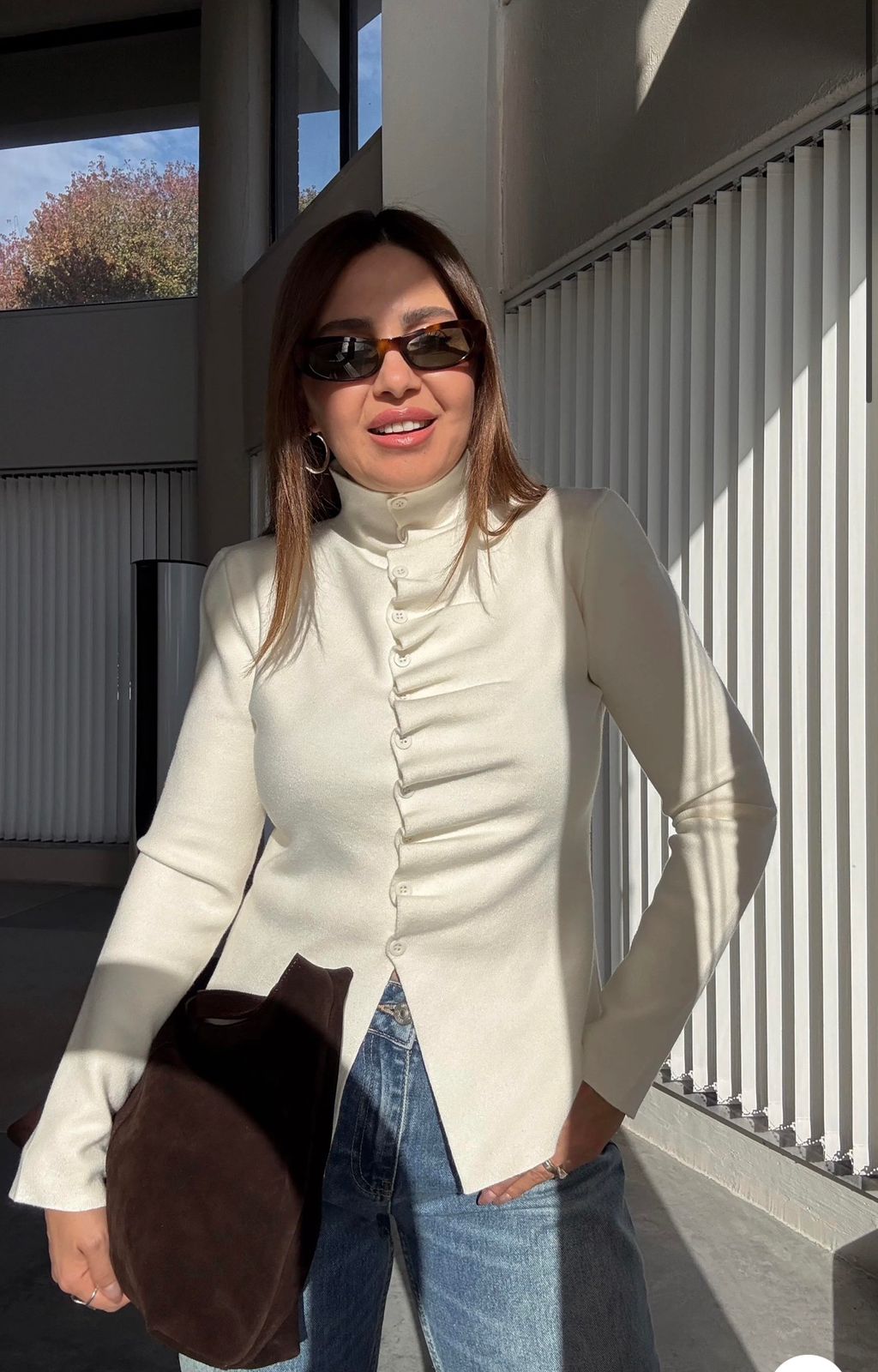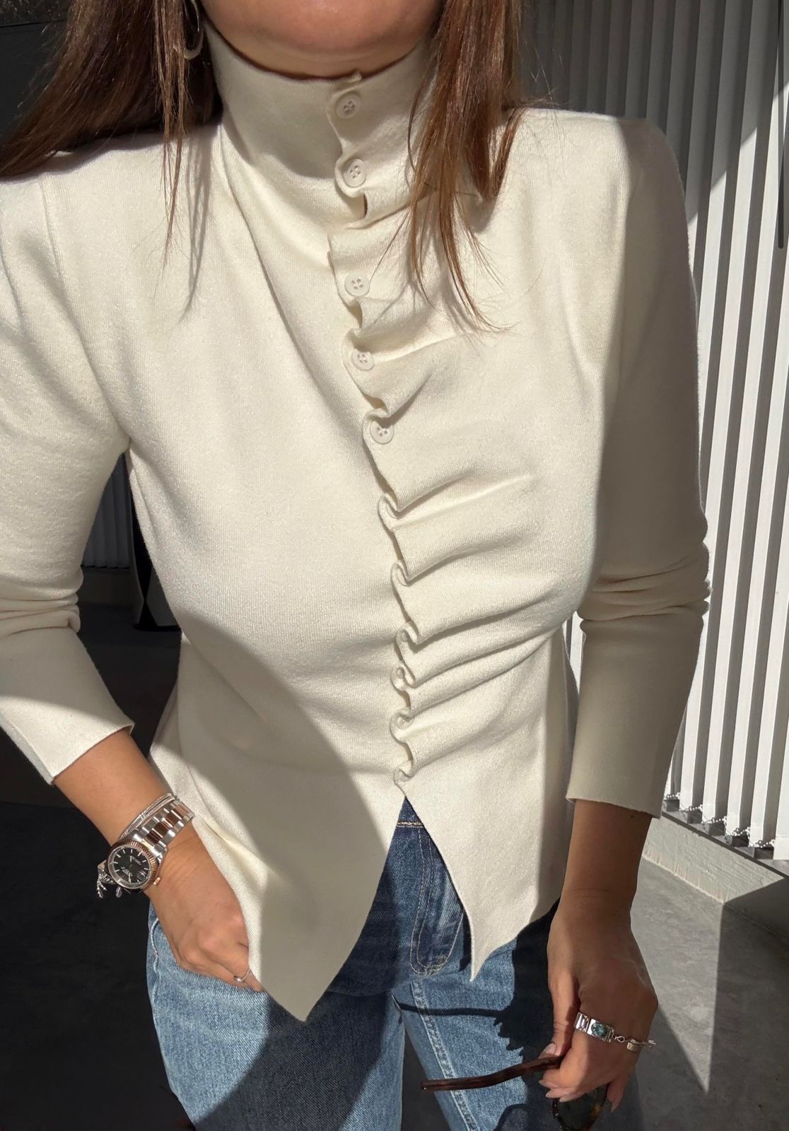 Drape Detail Low Shoulder Textured Navy Blue Blouse