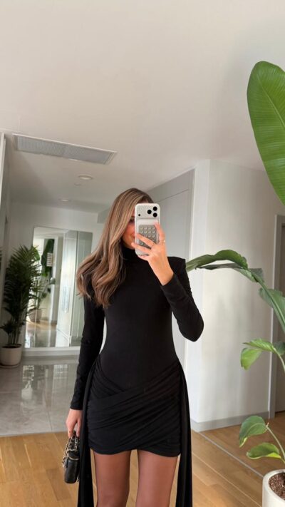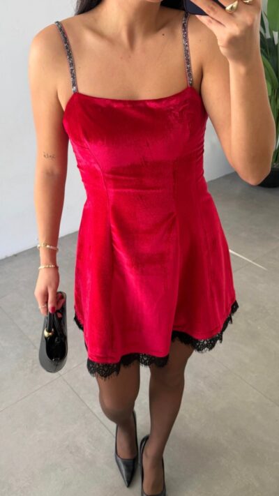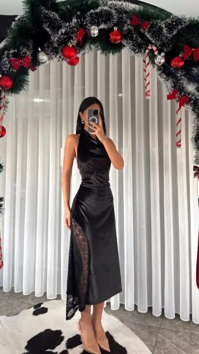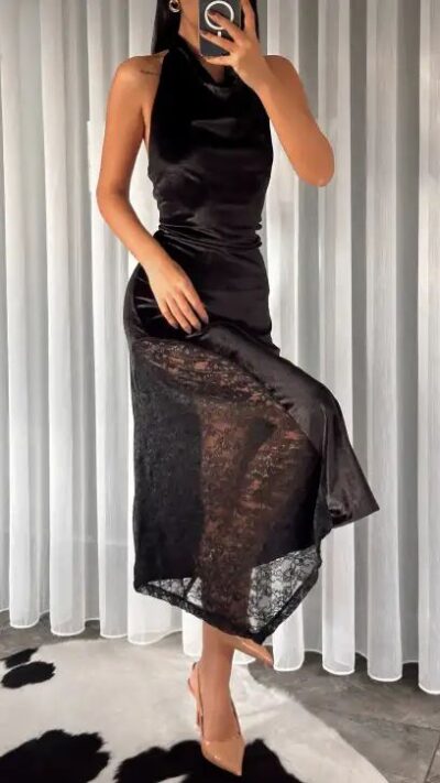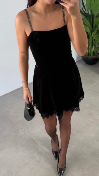 Astral Black Draped Zero Sleeve Skirt Lace Velvet Dress