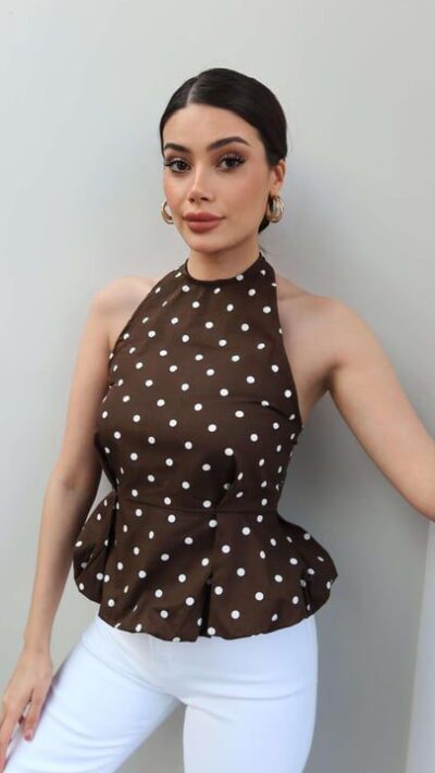 Brown Polka Dot Halter Peplum Top