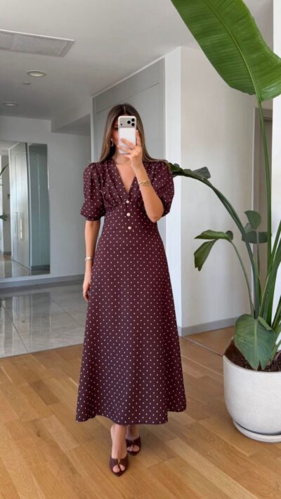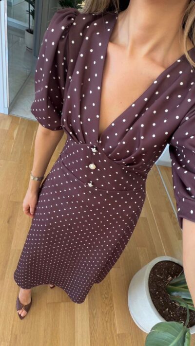 Brown Polka Dot Puff Sleeve Midi Dress